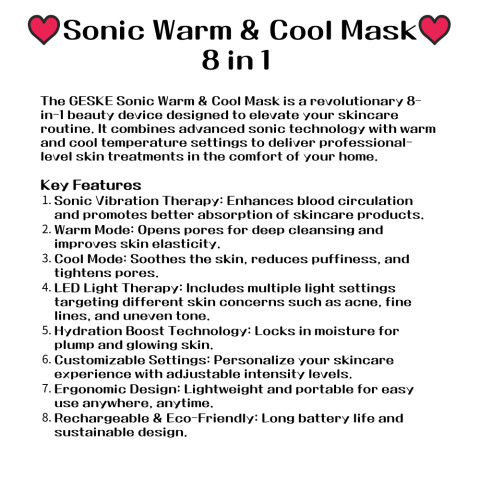 Geske Sonic Warm & Cool Mask 8 in 1 มาส์กหน้าดูแลผิวแบบครบจบในชิ้นเดียว ด้วยระบบ อุ่น-เย็น และการทำงานแบบ โซนิค ช่วยยกระดับการบำรุงให้ผิวดูสดชื่น เรียบเนียน และผ่อนคลาย เหมาะสำหรับผู้ที่อยากดูแลผิวแบบเร่งด่วนที่บ้านได้ทุกวัน