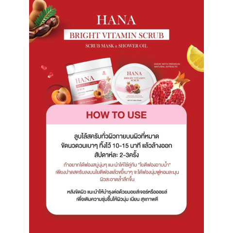 ใช้ ฮานะสครับ นวดวนเบา ๆ บริเวณที่ต้องการดูแล แล้วล้างออกให้สะอาด (แนะนำสัปดาห์ละ 1–2 ครั้ง)