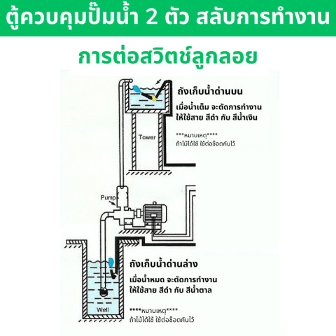 ลูกลอยตัวที่ 2 (ถังพักน้ำด้านบน): สั่งให้ปั๊มทำงานเมื่อน้ำลด และหยุดเมื่อเต็ม เพื่อป้องกันน้ำล้น