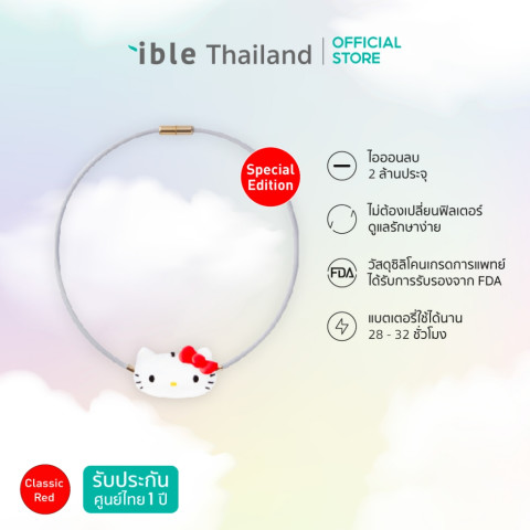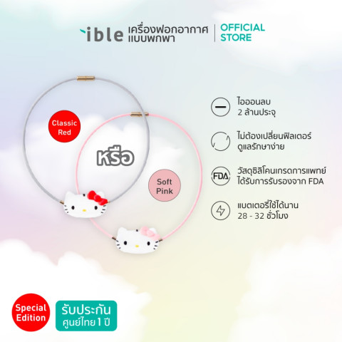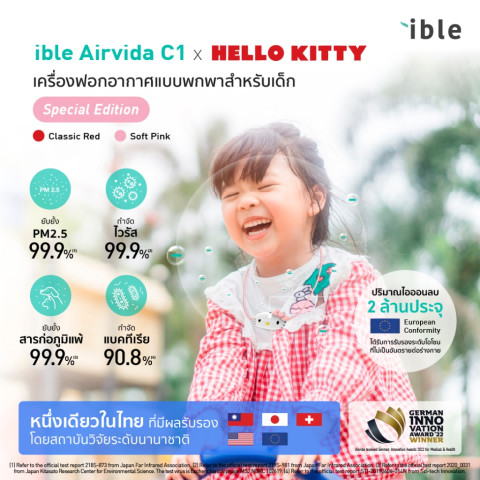 ible Airvida C1 X Hello Kitty เครื่องฟอกอากาศชนิดพกพา รุ่นพิเศษดีไซน์ใหม่ สำหรับเด็กอายุ 3 ปีขึ้นไป ให้ลูกน้อยได้หายใจอากาศที่สะอาดขึ้นตลอดวัน ไม่ว่าจะอยู่ที่โรงเรียน ระหว่างเดินทาง หรือทำกิจกรรมกลางแจ้ง ด้วยเทคโนโลยีผลิต ไอออนลบ 2,000,000 ประจุ/ซม.3 ทุก 0.6 วินาที รอบบริเวณใบหน้า ช่วยลดฝุ่น PM2.5 ละอองเกสร และสารก่อภูมิแพ้ที่อาจสูดเข้าร่างกายได้ในชีวิตประจำวัน