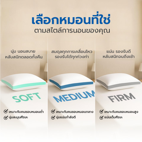 Soft: นุ่ม เหมาะสำหรับผู้ที่ชอบหมอนไม่สูง