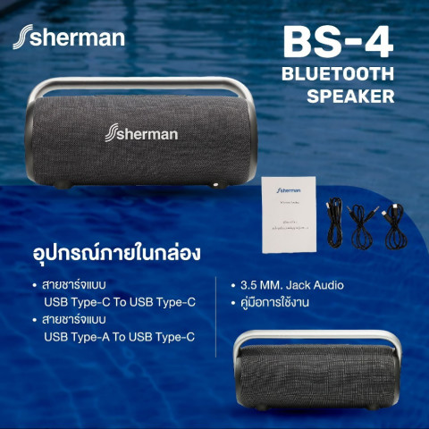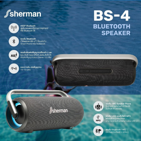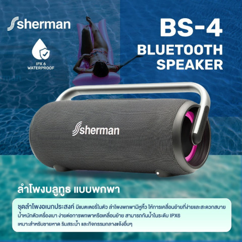 Sherman BS-4 Portable Bluetooth Speaker ลำโพงบลูทูธพลังเบสคู่ กำลังขับ RMS 110W (Peak 220W) อัดแน่นเสียงกระหึ่มด้วยซับวูฟเฟอร์ 5.25" ผสานลำโพงกลางและทวีตเตอร์ให้รายละเอียดครบทั้งย่านต่ำ-แหลม พร้อมไฟ RGB สร้างบรรยากาศสุดมันส์ เหมาะทั้งปาร์ตี้ในบ้าน ชายหาด ริมสระน้ำ และกิจกรรมกลางแจ้ง ด้วยมาตรฐานกันน้ำกันฝุ่น IPX6 และแบตเตอรี่ความจุใหญ่ 7.4V 7000mAh พกพาสะดวก ใช้งานได้มั่นใจทุกทริป