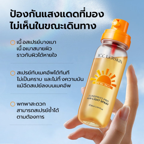 ICE LERSKIN สเปรย์กันแดด SPF50+ PA+++ กันน้ำ กันเหงื่อ ฉีดซ้ำได้ระหว่างวัน พกพาง่าย ขนาด 90ml+90ml (โปรออนไลน์สุดคุ้ม ซื้อ 1 แถม 1) ในราคา 373.56 ปกป้องผิวจากแสงแดดแบบบางเบา สบายผิว ใช้ได้ทั้งผิวหน้าและผิวกาย เหมาะกับวันเร่งรีบและกิจกรรมกลางแจ้ง