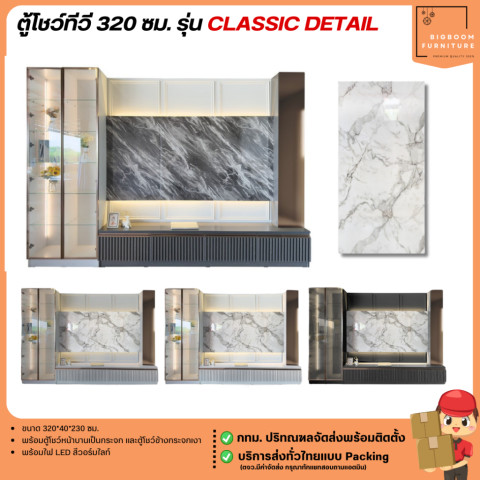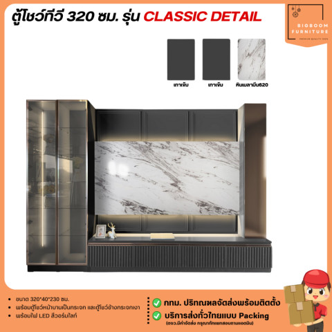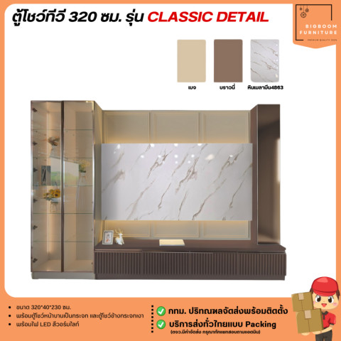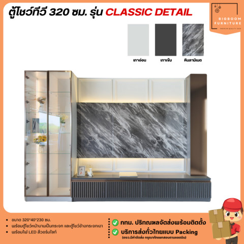 ตู้โชว์ทีวี 320 ซม. รุ่น CLASSIC DETAIL ดีไซน์หรูสไตล์คลาสสิกที่ช่วยยกระดับห้องนั่งเล่นให้ดูโปร่ง โล่ง และเป็นระเบียบในทันที มาพร้อมตู้โชว์กระจกและตู้โชว์ข้างกระจกเงา เพิ่มมิติความพรีเมียมให้พื้นที่จัดวางของสะสม ของตกแต่ง หรือชุดเครื่องแก้วได้อย่างโดดเด่น โดยมีไฟ LED สีวอร์มไลท์ ช่วยขับความสวยงามให้ดูอบอุ่นน่าอยู่ทั้งกลางวันและกลางคืน
