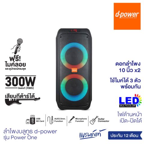 d-power Music Party Box Power1 ลำโพงปาร์ตี้สายโหดสำหรับงานสังสรรค์ คาราโอเกะ และกิจกรรมกลางแจ้ง มาพร้อมดอกลำโพงขนาด 10 นิ้ว 2 ดอก ให้พลังเสียงแน่นเต็มห้องด้วยกำลังขับ 300W (RMS) เสริมบรรยากาศด้วยไฟ RGB Party Light ปรับได้ถึง 6 รูปแบบ พร้อมล้อลาก เคลื่อนย้ายง่าย ใช้ได้ทั้งโหมดแบตเตอรี่และเสียบปลั๊ก ตอบโจทย์ทุกที่ทุกเวลา ในราคา 6,990.00 บาท