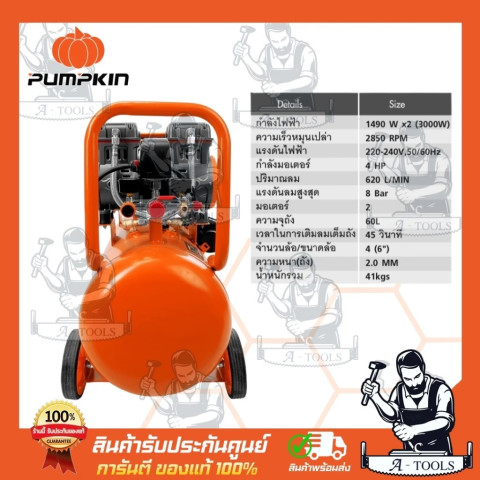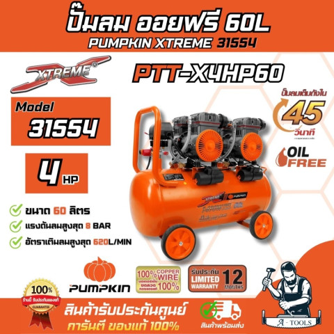 PUMPKIN ปั๊มลม ออยฟรี 60 ลิตร รุ่น 31554 / PTT-X4HP60 ปั๊มลมเสียงเงียบ ใช้งานสะอาดไม่ต้องใช้น้ำมัน เหมาะทั้งงานช่าง งานลมในบ้าน/อู่ซ่อม และงานที่ต้องการลมสม่ำเสมอ พร้อมจัดส่งรวดเร็ว ของแท้ 100% และ รับประกัน 12 เดือน