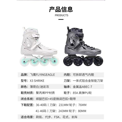 Professional Roller Skates Flying Eagle X3 โรลเลอร์สเก็ตสำหรับผู้ใหญ่ระดับเริ่มต้น ดีไซน์เท่ ใส่ง่าย เหมาะทั้งนักศึกษาในมหาวิทยาลัยและการใช้งานทั่วไปได้ทั้งผู้ชายและผู้หญิง มาพร้อมเซ็ตคุ้มค่า “รองเท้าสเก็ต + เกียร์ป้องกัน + กระเป๋า” ให้คุณเริ่มต้นเล่นได้อย่างมั่นใจตั้งแต่ครั้งแรก
