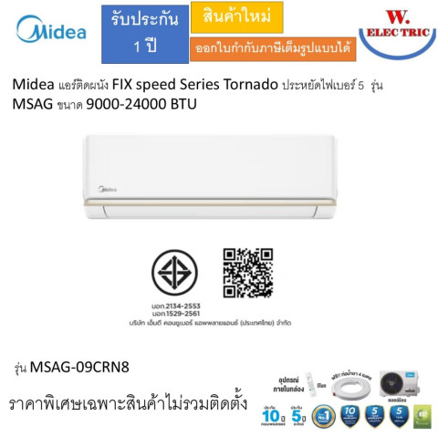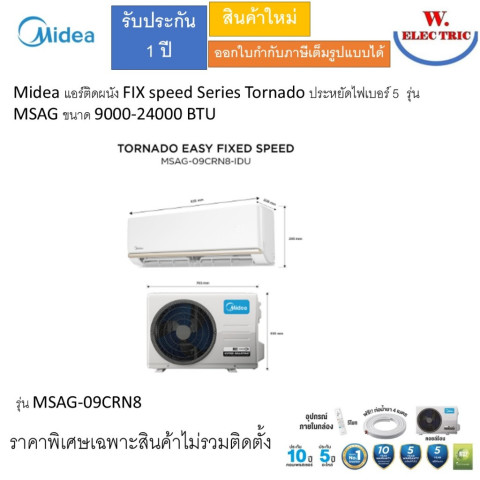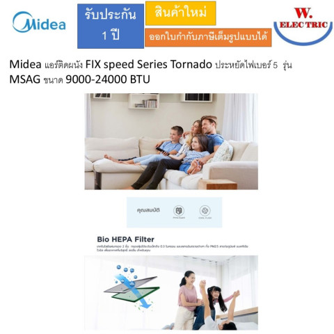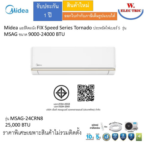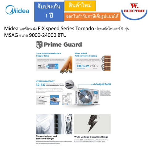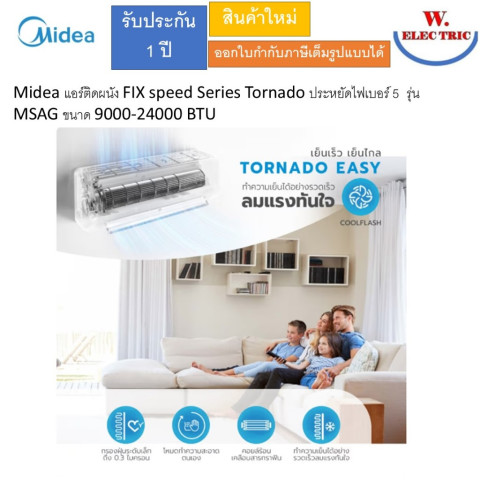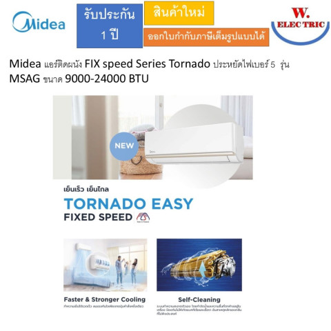 Midea แอร์ติดผนัง FIX Speed Series Tornado รุ่น MSAG (ขนาด 9,000–24,000 BTU) แอร์บ้านตัวคุ้มที่ให้ลมเย็นเร็ว ใช้งานง่าย และประหยัดไฟด้วยฉลาก เบอร์ 5 เหมาะสำหรับบ้าน คอนโด หรือออฟฟิศที่ต้องการความเย็นสบายแบบสม่ำเสมอ พร้อมบริการ ส่งฟรี และมีตัวเลือกแบบ รวมติดตั้ง ตามเงื่อนไขของบริษัท