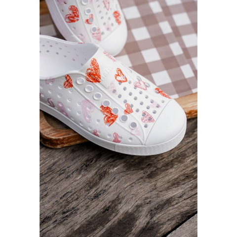Native รองเท้ากันน้ำเด็กเล็ก EVA รุ่น Jefferson Print Shell White/ Shell White/ Heart Graffiti (ไซซ์ C13) คือรองเท้าคู่โปรดสำหรับวันลุยๆ ของเด็กเล็ก ด้วยดีไซน์คลาสสิกอันเป็นรุ่นซิกเนเจอร์ของ Native โทนสีขาวสะอาดตาพร้อมลาย Heart Graffiti น่ารักโดดเด่น ใส่ง่าย เข้ากับทุกลุค ตั้งแต่ไปโรงเรียน ไปเที่ยว ไปเล่นสนาม หรือวันฝนตกก็เอาอยู่