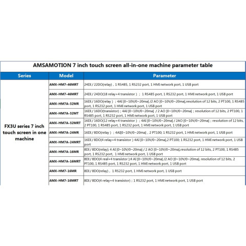 AMX-HM7A-16MR: 8DI / 8DO (รีเลย์), 4AI / 2AO, 2 PT100, RS485 x1, RS232 x1, พอร์ตเครือข่าย HMI x1, USB x1