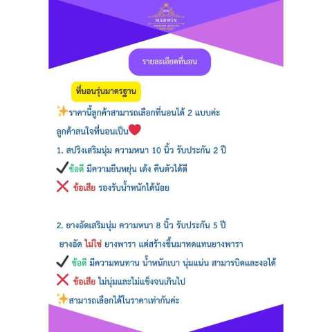 มีที่นอนให้เลือก 2 รุ่น สามารถทักข้อความเพื่อสอบถามรายละเอียดและเลือกรุ่นที่เหมาะกับคุณ
