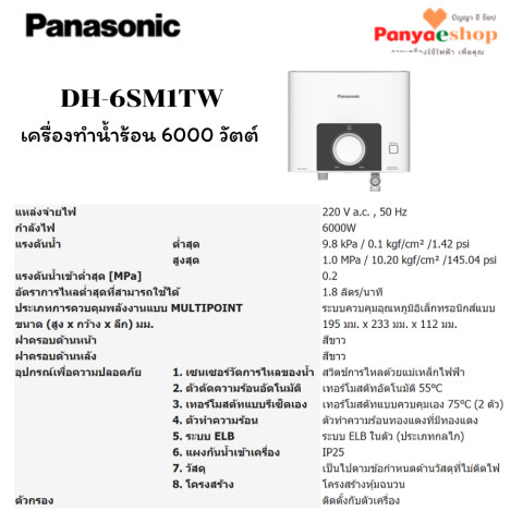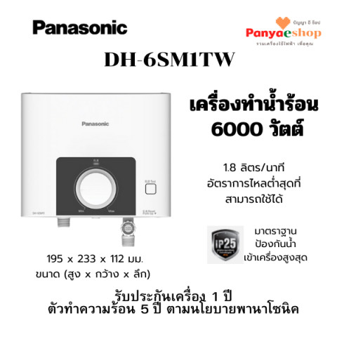 PANASONIC เครื่องทำน้ำร้อน 6000W รุ่น DH-6SM1TW ดีไซน์กะทัดรัด สูงเพียง 19.5 ซม. ติดตั้งง่าย ประหยัดพื้นที่ เหมาะกับห้องน้ำหลากหลายขนาด ให้ความอุ่นสบายได้รวดเร็วด้วยกำลังไฟสูงสุด 6,000 วัตต์ พร้อมระบบควบคุมอุณหภูมิแบบอิเล็กทรอนิกส์ ปรับได้อย่างนุ่มนวล (Stepless) เพื่อประสบการณ์อาบน้ำที่เสถียรและปลอดภัยในทุกวัน