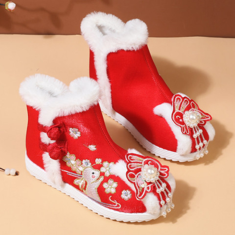 เติมเสน่ห์แบบจีนดั้งเดิมให้ลุคฤดูหนาวของน้องๆ ด้วย รองเท้าสไตล์จีนฮันฟู ปักสีแดง ดีไซน์ชาติพันธุ์ที่โดดเด่นด้วยงานปักโทนแดงสุดละมุน เข้ากับชุดฮันฟู ชุดจีน หรือแมตช์กับชุดลำลองก็สวยสะดุดตา เหมาะสำหรับเด็กผู้หญิงอายุประมาณ 12 ปี ใส่ไปงานโรงเรียน งานแสดง งานเทศกาล หรือใส่เที่ยวในวันสบายๆ