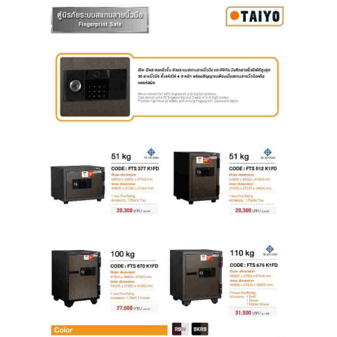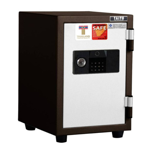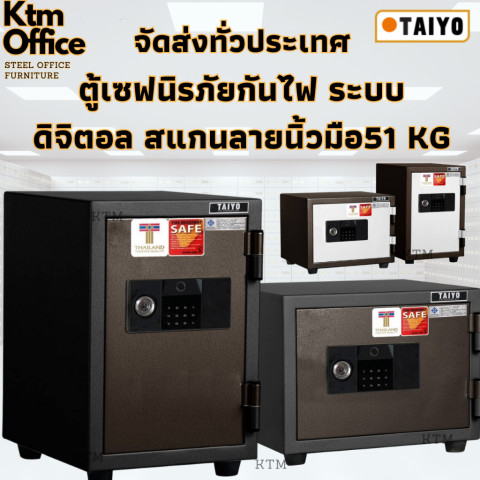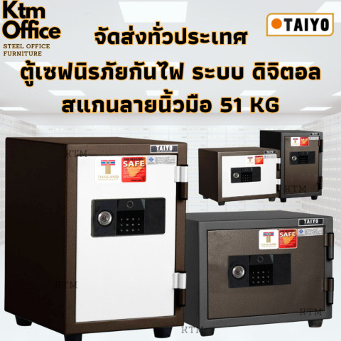 Taiyo ตู้เซฟนิรภัยดิจิตอล ระบบสแกนนิ้วมือ น้ำหนัก 51 กก. ปกป้องทรัพย์สินสำคัญของคุณด้วยตู้เซฟดีไซน์ทันสมัย แข็งแรง ทนทาน มาพร้อมระบบล็อก 3 ชั้น ทั้งสแกนลายนิ้วมือ ดิจิตอล และกุญแจ เพิ่มความอุ่นใจทั้งบ้านและออฟฟิศ พร้อมฉนวนกันไฟคุณภาพสูงมาตรฐานญี่ปุ่น ทนไฟได้ 1 ชั่วโมงที่อุณหภูมิ 1010°C