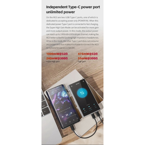 โหมดเดสก์ท็อปที่ได้รับสิทธิบัตร ช่วยให้ M23 รับไฟจากแหล่งจ่ายภายนอกโดยตรง และไม่ชาร์จ/คายประจุแบตเตอรี่ในตัว ลดความกังวลเรื่องแบตเสื่อมเมื่อใช้ฟังยาวๆ บนโต๊ะทำงานพอร์ต USB Type-C 2 ช่อง แยก Power In โดยเฉพาะ