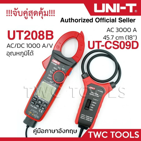 UNI-T UT-208B + UT-CS09D ชุดคู่คลิปแอมป์ True RMS 1000A/1000V พร้อมเฟล็กแคล้มป์ (Rogowski Coil) ขยายการวัดกระแสได้สูงสุด 3000A เหมาะสำหรับช่างไฟมืออาชีพ งานตู้คอนโทรล อินเวอร์เตอร์/VFD และจุดที่มีพื้นที่แคบที่คีมปกติสอดเข้าไม่ถึง มาพร้อมมาตรฐานความปลอดภัยระดับสูง CAT III 1000V / CAT IV 600V และการรับรอง CE, UKCA, cETLus
