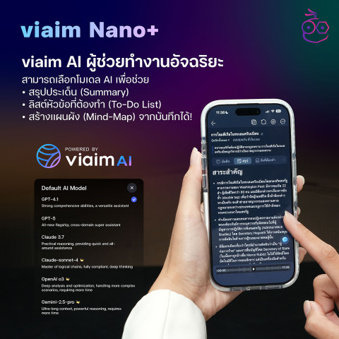 viaim AI Meeting Set คือผู้ช่วยประชุมที่ทำให้คุณ “โฟกัสที่การคุย” แล้วปล่อยให้การจด การถอดเสียง และการสรุป เป็นหน้าที่ของ AI—ประหยัดเวลา ทำงานเป็นระบบ และพร้อมต่อยอดเป็นแผนงานได้ทันที