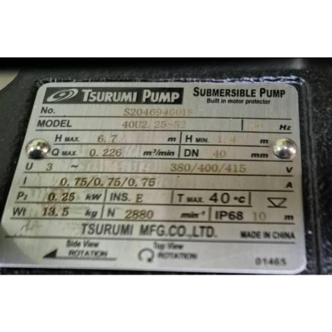 TSURUMI ปั๊มจุ่มขนาดท่อ 1.5 นิ้ว มอเตอร์ 0.3HP รุ่น 40U2.25 ปั๊มจุ่มคุณภาพสำหรับงานสูบน้ำปนตะกอนและงานบำบัดน้ำเสีย โดดเด่นด้วยตัวเรือนและใบพัดเหล็กหล่อ แข็งแรง ทนทาน พร้อมใช้งานต่อเนื่องในสภาพแวดล้อมงานจริง เหมาะกับงานระบายน้ำเสียจากอาคาร โรงแรม โรงงาน งานก่อสร้าง และงานอุตสาหกรรมทั่วไป
