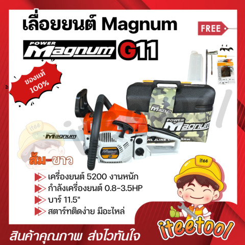 เลื่อยยนต์ Magnum G11 แท้ 100% บาร์ 11.5" ตัว Top รุ่นงานหนักมาก (เครื่อง 5200) ตัวจบสำหรับงานตัดไม้จริงจัง สตาร์ทง่าย เครื่องแรง ใช้งานต่อเนื่องได้ดี ร้อนไม่ดับ พร้อมชุดอุปกรณ์และโซ่ Magnum แท้ให้ครบ แกะกล่องใช้งานได้ทันที ในราคา 5,789.70 บาท