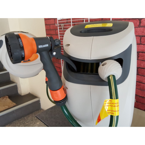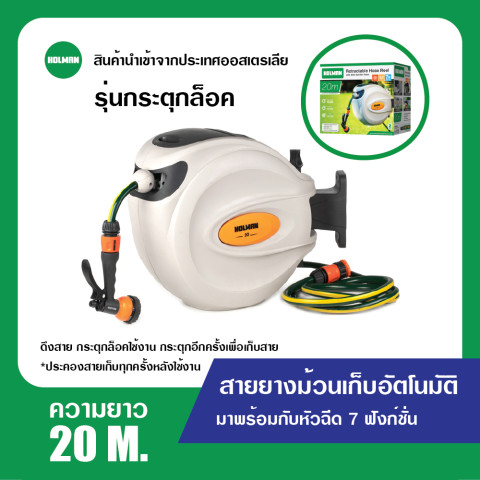 สายยางม้วนเก็บอัตโนมัติ ขนาด 20 เมตร (H20M) ตัวช่วยงานสวนและงานทำความสะอาดที่ทำให้ชีวิตง่ายขึ้น ไม่ต้องก้มเก็บสายยางให้เมื่อยอีกต่อไป เพียง กระตุกสายยาง 1 ครั้ง ระบบจะม้วนเก็บกลับแบบอัตโนมัติ ช่วยจัดระเบียบพื้นที่ให้ดูเรียบร้อย พร้อมใช้งานทุกครั้ง เหมาะทั้งรดน้ำต้นไม้ ล้างรถ ล้างพื้น และงานบ้านรอบบ้าน