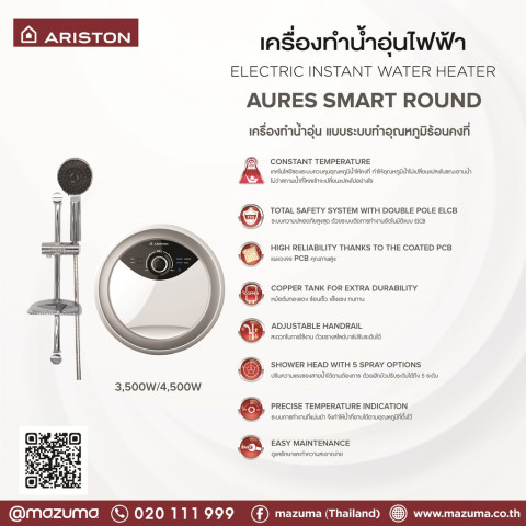 Ariston เครื่องทำน้ำอุ่น รุ่น Aures Smart Round RMC35E 3500 วัตต์ ดีไซน์อิตาเลียนทรงกลมบางเฉียบ ทันสมัย เปลี่ยนทุกการอาบน้ำให้สบายและปลอดภัยยิ่งขึ้น ด้วยระบบควบคุมอุณหภูมิแบบอิเล็กทรอนิกส์ที่แม่นยำ ให้น้ำอุ่นคงที่ตามต้องการ พร้อมฟังก์ชันป้องกันน้ำร้อนลวกและระบบตัดไฟอัตโนมัติ เพิ่มความมั่นใจให้ทั้งบ้าน