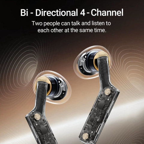 ดีไซน์แบบ semi‑in‑ear ใส่นานไม่อึดอัด ก้านหูฟังเอียงรับเสียงเข้าปากได้ดี พร้อม Bone‑conduction sensor, ไมโครโฟนคู่ และ Vector Noise Cancellation ช่วยให้เสียงสนทนาชัดแม้ในที่คนเยอะโหมดการแปลหลากหลาย