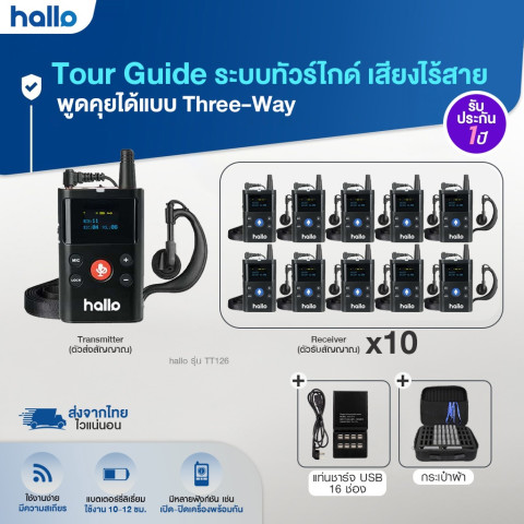 hallo Tour Guide ทัวร์ไกด์เสียงไร้สาย Three-Way รุ่น TT126 ระบบสื่อสารสำหรับการนำทัวร์และการสอนที่ต้องการ “ได้ยินชัด โต้ตอบได้จริง และเสถียร” รองรับการสื่อสารแบบ 3 ทาง (Three-way) ช่วยให้ไกด์/วิทยากรและผู้เข้าร่วมสามารถโต้ตอบแบบเรียลไทม์ ลดปัญหาเสียงรบกวนในพื้นที่คนเยอะ น้ำหนักเบา พกพาง่าย ใช้ได้ทั้งพิพิธภัณฑ์ โรงงาน งานประชุม โรงเรียนสอนขี่ม้า และกิจกรรมภาคสนามทุกประเภท
