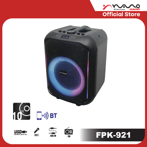 NANO Party Box รุ่น FPK-921 ลำโพงบลูทูธพกพาที่เกิดมาเพื่อสายปาร์ตี้ ให้เสียงดังสะใจด้วยกำลังขับ 80W พร้อมไฟ LED เพิ่มบรรยากาศ สนุกได้ทุกที่ทุกเวลา แบตอึดใช้งานต่อเนื่องสูงสุด 10 ชั่วโมง และยังต่อไมค์/กีต้าร์ได้ เหมาะทั้งร้องคาราโอเกะ ซ้อมดนตรี หรือเปิดเพลงในงานสังสรรค์แบบจัดเต็ม