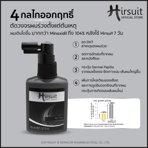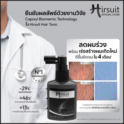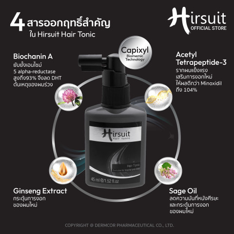 ค้นพบคำตอบของปัญหาผมร่วงและผมบางด้วย Hirsuit Hair Tonic 45ml. เฮอร์ซูท แฮร์โทนิค โทนิคบำรุงหนังศีรษะสูตรเข้มข้นที่ช่วยลดผมร่วง พร้อมเร่งการเกิดผมใหม่ให้ดกดำ แข็งแรง และมีสุขภาพดี เหมาะสำหรับทั้งผู้หญิงและผู้ชายที่ต้องการฟื้นฟูความมั่นใจให้กลับมาอีกครั้ง