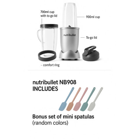ในชุดมาพร้อมอุปกรณ์ครบเซ็ต ทั้งฐานผสม ใบมีดเปลี่ยนได้ ถ้วย 700 มล. ฝาแบบ To-go แหวนจับ และช้อนตวงโบนัส ให้คุณเริ่มต้นเส้นทางสุขภาพได้ทันทีตั้งแต่แก้วแรก Nutribullet NB908 คือตัวช่วยสำคัญสำหรับผู้ที่กำลังควบคุมอาหาร ผู้รักการออกกำลังกาย และคนที่ต้องการเลือกสิ่งที่ดีกว่าให้กับร่างกายทุกวัน