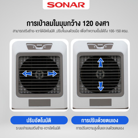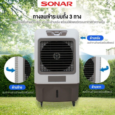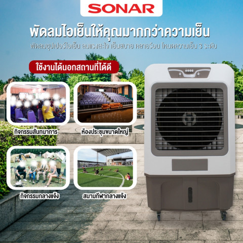 เพิ่มความเย็นสบายให้ทุกมุมบ้านและพื้นที่ใช้งานขนาดใหญ่ด้วย SONAR พัดลมไอเย็น 150 ลิตร รุ่น EA-P1900 พัดลมไอเย็นมอเตอร์ทรงพลัง ที่ให้ลมเย็นมากกว่าพัดลมไอเย็นทั่วไปถึง 2 เท่า แต่ยังคงประหยัดพลังงานกว่าการใช้เครื่องปรับอากาศถึง 10 เท่า เหมาะสำหรับบ้านพักอาศัย ร้านอาหาร คาเฟ่ โกดังโชว์รูม หรือพื้นที่เปิดโล่งที่ต้องการความเย็นต่อเนื่อง