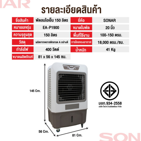 เลือกใช้ SONAR พัดลมไอเย็น 150 ลิตร รุ่น EA-P1900 เพื่อสัมผัสลมเย็นทรงพลัง ประหยัดพลังงาน ใช้งานทนทาน พร้อมการรับประกันและบริการหลังการขายที่เชื่อถือได้ ช่วยให้คุณคลายร้อนอย่างคุ้มค่าในทุกวัน