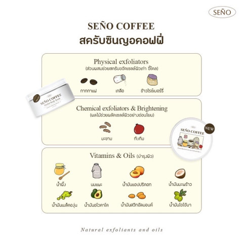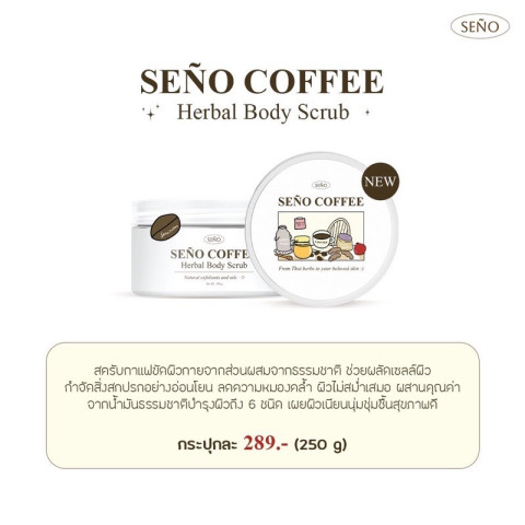 เติมเสน่ห์ให้ผิวกายของคุณด้วย Seño Body Scrub สครับคอฟฟี่สูตรเข้มข้นที่ทั้งทำความสะอาดและบำรุงในขั้นตอนเดียว ให้ผิวเนียนนุ่ม ชุ่มชื้น ดูสุขภาพดีทุกครั้งที่ใช้