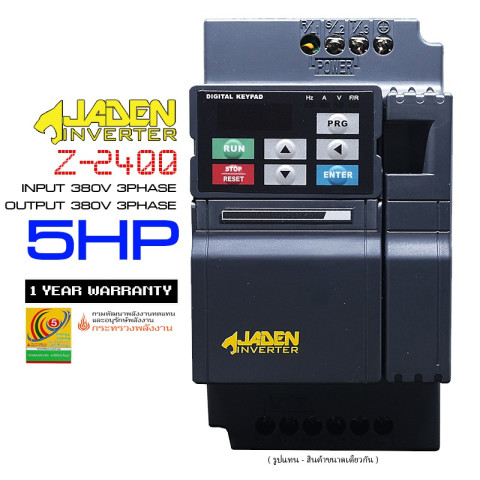 JADEN INVERTER อินเวอร์เตอร์ 5 แรงม้า รุ่นประหยัด Z2400-3R7G/5R5P ออกแบบมาเพื่อควบคุมความเร็วรอบมอเตอร์ 3 เฟส 380V สำหรับงานอุตสาหกรรมทั่วไป ทั้งงานกลึง ไส ปาด เจียร และระบบลิฟต์ขนของ ให้การทำงานที่ลื่นไหล ควบคุมง่าย และประหยัดพลังงานด้วยมาตรฐานเบอร์ 5 จากกระทรวงพลังงาน เหมาะอย่างยิ่งสำหรับโรงงานหรือผู้ใช้งานที่ต้องการอุปกรณ์ปรับรอบมอเตอร์ (VSD) ที่เชื่อถือได้และคุ้มค่าคุ้มราคา