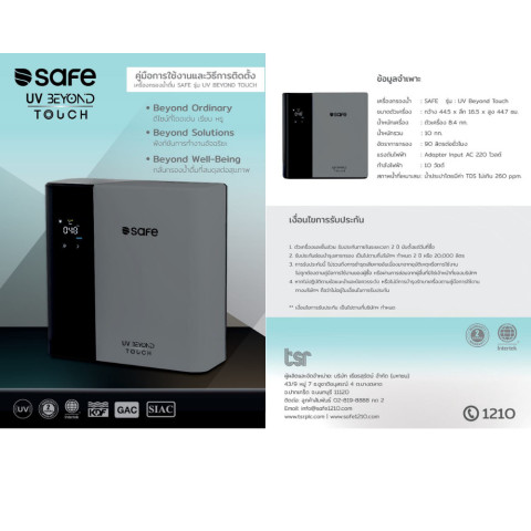SAFE เครื่องกรองน้ำ รุ่น UV Beyond Touch คือทางเลือกที่ลงตัวสำหรับผู้ที่มองหาน้ำดื่มคุณภาพสูง ใช้งานง่าย ทันสมัย และใส่ใจในทุกหยดน้ำที่เข้าสู่ร่างกายคุณ