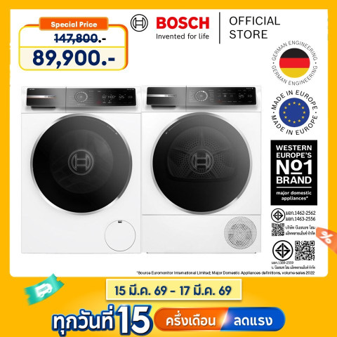 ยกระดับห้องซักผ้าของคุณให้เป็นสตูดิโาดูแลเสื้อผ้าแบบมืออาชีพ ด้วยเซ็ตคู่สุดคุ้มจาก Bosch ซีรีส์ 8 ประกอบด้วย เครื่องซักผ้าฝาหน้า 10 กก. รุ่น WGB254A0TH และ เครื่องอบผ้าฮีตปั้ม 9 กก. รุ่น WQB245B0TH มาพร้อมเทคโนโลยี Home Connect ที่ช่วยให้คุณควบคุมการซัก–อบได้ง่ายๆ ผ่านสมาร์ตโฟน ทั้งสะดวก ประหยัดเวลา และถนอมเนื้อผ้าอย่างเหนือชั้น ในดีไซน์สวยหรูแบบยุโรป