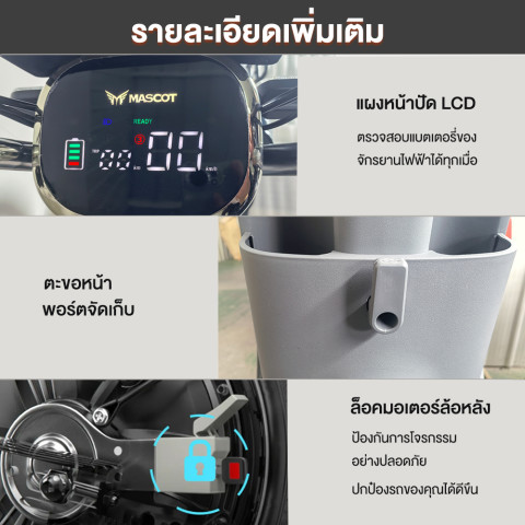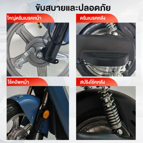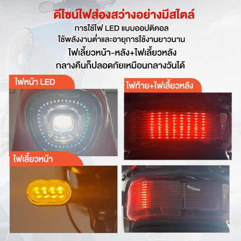 ตัวรถมาพร้อมโครงสร้างแข็งแรง รองรับน้ำหนักได้ถึง 180 กก. ใช้งานได้ทั้งผู้ใหญ่หรือบรรทุกของเพิ่มเติม เบาะนั่งนุ่มนั่งสบาย ระบบไฟครบครันทั้งไฟหน้า LED สว่างชัด ไฟเลี้ยวหน้า–หลัง และไฟท้ายเพื่อความปลอดภัยบนท้องถนน ตอบโจทย์ทั้งการใช้งานในชีวิตประจำวันและการเดินทางเพื่อการทำงาน