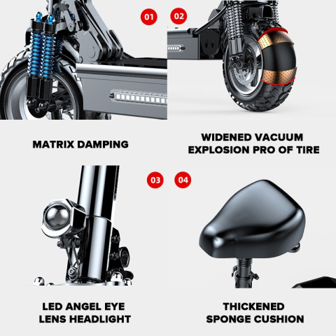 SEALUP Q7 มาพร้อมยางสูญญากาศออฟโรดขนาด 11 นิ้ว แบบไร้ยางใน เนื้อยางกว้างและหนา กันระเบิดและเกาะถนนดีเยี่ยม ผลิตร่วมกับ Chaoyang แบรนด์ยางสูญญากาศระดับโลก อายุการใช้งานยาวนาน ใช้งานได้อย่างมั่นใจยาวๆ ตัวรถแข็งแรงด้วยเฟรมอลูมิเนียมอัลลอยพรีเมียม รับน้ำหนักได้สูงสุดถึง 200 กก. และปีนทางชันได้สูงสุดถึง 30 องศา เหมาะสำหรับผู้ใหญ่และการใช้งานจริงจัง