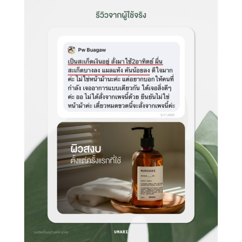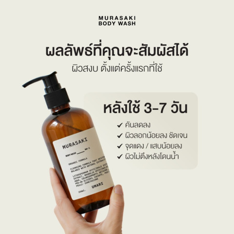 สัมผัสประสบการณ์การอาบน้ำที่อ่อนโยนล้ำลึกด้วย UMARI Murasaki Body Wash 250 ml. (อูมาริ มุราซากิ บอดี้ วอช) เจลอาบน้ำสูตรพิเศษที่คิดค้นมาเพื่อผิวแพ้ง่าย ช่วยทำความสะอาดผิวอย่างนุ่มนวล พร้อมมอบความชุ่มชื้นและปลอบประโลมผิวในทุกวันของการดูแลตัวเอง