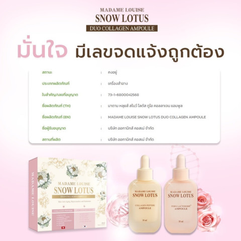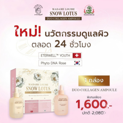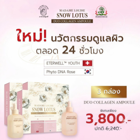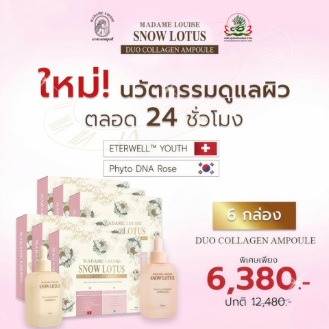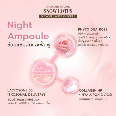 เซรั่ม เช้า | เย็น มาดามหลุยส์ DUO COLLAHEN AMPOULE แอมพูลเข้มข้นสูตร Snow Lotus ที่ผสานนวัตกรรม Rose DNA และ ETERWELL™ YOUTH เพื่อสร้างระบบบำรุงอัจฉริยะตลอด 24 ชั่วโมง ฟื้นฟูผิววัย 40+ ให้กลับมาสดใส อิ่มฟู และมีเกราะป้องกันที่แข็งแรงตั้งแต่เช้าจนถึงค่ำ