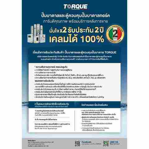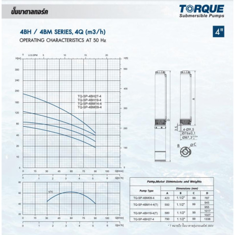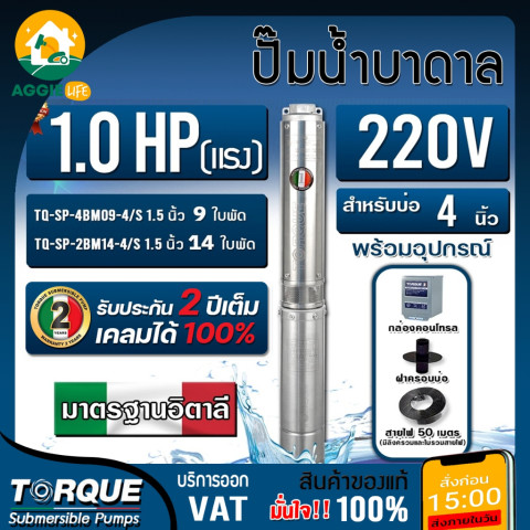 TORQUE ปั๊มบาดาล 1 HP 220V รุ่น TQ-SP-4BM09-4/S และ TQ-SP-2BM14-4/S ปั๊มน้ำซับเมิส (Submersible Pump) สำหรับบ่อบาดาลขนาด 4 นิ้ว ออกแบบมาเพื่อการดูดน้ำจากระดับความลึกได้อย่างมีประสิทธิภาพ เหมาะสำหรับงานสูบน้ำในครัวเรือน ฟาร์มการเกษตร บ่อบาดาล ระบบน้ำสำรอง และงานที่ต้องการแรงดันสูงต่อเนื่อง ตัวปั๊มผลิตจากวัสดุคุณภาพดี ทนทานต่อการใช้งานระยะยาวและการจมน้ำอย่างต่อเนื่อง