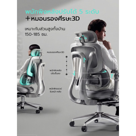 รองรับสรีระผู้ใช้งานตั้งแต่ความสูง 150–185 ซม. ด้วยพนักพิงหลังปรับได้ 5 ระดับ ร่วมกับหมอนรองศีรษะแบบ 3D ที่สามารถหมุน ปรับสูง-ต่ำ และปรับเอียง เพื่อให้คอและศีรษะอยู่ในองศาที่สบายที่สุด นั่งทำงานทั้งวันก็ไม่เมื่อยคอ ลดความตึงที่บ่าและไหล่