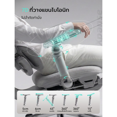 ที่วางแขน 7D อัจฉริยะ ปรับได้รอบทิศทาง ตอบโจทย์ทุกท่วงท่านั่ง ไม่ว่าจะพิมพ์งาน ใช้เม้าส์ เล่นเกม หรือถือแท็บเล็ต ช่วยลดแรงกดที่หัวไหล่ ข้อมือ และข้อศอกอย่างเห็นได้ชัด