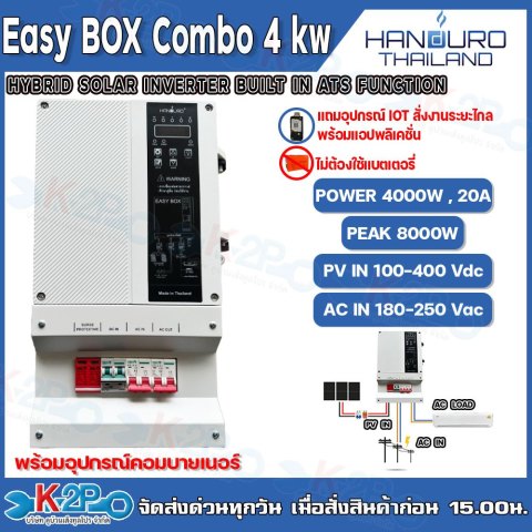 สัมผัสประสบการณ์ระบบโซลาร์ที่ติดตั้งง่าย ครบในกล่องเดียวด้วย HANDURO Easy Box Combo อินเวอร์เตอร์โซล่าไฮบริด 4kW 1 Phase พร้อมอุปกรณ์คอมบายเนอร์ รุ่น HD-ES-4K/220V-L1 โซลูชันสำหรับบ้านพักอาศัยและธุรกิจขนาดเล็กที่ต้องการใช้งานพลังงานแสงอาทิตย์อย่างคุ้มค่า ปลอดภัย และเสถียร พร้อมออกแบบมาให้ติดตั้งและใช้งานได้อย่างสะดวก แม้ไม่ใช่ผู้เชี่ยวชาญก็สามารถเริ่มต้นระบบโซลาร์ของคุณได้ทันที