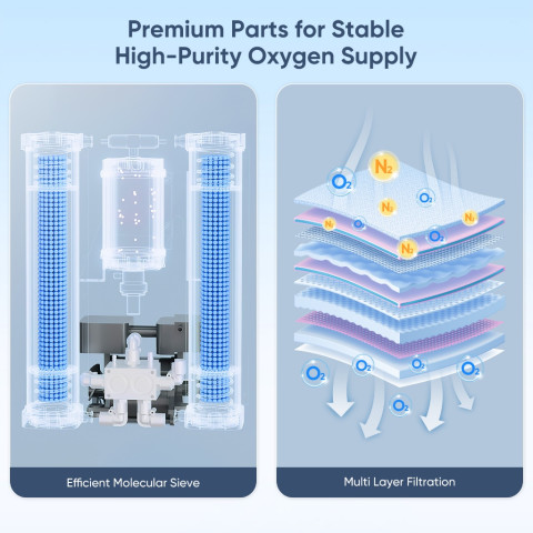 ใช้ได้ทั้งเป็นเครื่องผลิตออกซิเจนและเครื่องพ่นยา มาพร้อมสายให้ออกซิเจนแบบแคนนูลา 2 ชุด และชุดพ่นยา 1 ชุด (หมายเหตุ: ไม่ควรสูดออกซิเจนและพ่นยาไปพร้อมกัน)ความเข้มข้นออกซิเจนสูง 93% ± 3% ทุกระดับการไหล