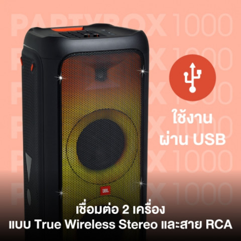 เติมไฟให้ทุกปาร์ตี้ของคุณด้วย ลำโพงบลูทูธกลางแจ้ง Partybox 1000 Wireless Bluetooth Speaker ของแท้ รับประกัน 1 ปี ลำโพงปาร์ตี้ระดับมืออาชีพจาก J B L ที่มาพร้อมพลังเสียงสะใจถึง 1100 วัตต์ RMS ให้เสียงดังกระหึ่ม ครบทุกย่านความถี่ ทั้งเบสลึกแน่น เสียงร้องชัด และเสียงแหลมใสคม เหมาะสำหรับทั้งงานในร่มและกลางแจ้ง ตั้งแต่ปาร์ตี้ที่บ้านไปจนถึงอีเวนต์ขนาดใหญ่