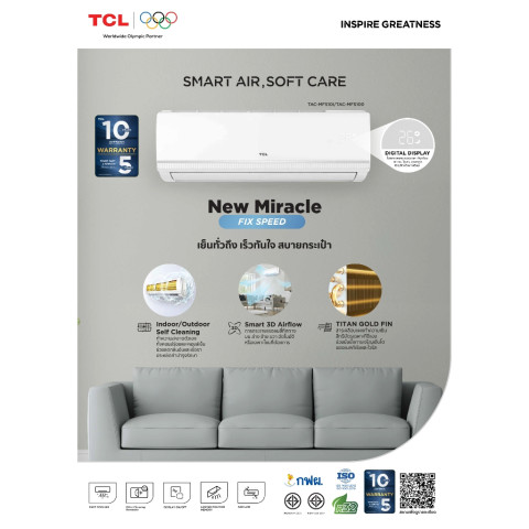 ด้วยคุณสมบัติที่ครบทั้งด้านความเย็น ความสะอาดของอากาศ ความทนทาน และโหมดการใช้งานที่ตอบโจทย์ทุกช่วงเวลา TCL Fixed Speed แอร์ 25,350 BTU รุ่น TAC-MFS New Miracle Series คือทางเลือกที่คุ้มค่า ทั้งสำหรับครอบครัวและธุรกิจ ที่ต้องการแอร์คุณภาพดีในราคาจับต้องได้ พร้อมโปรแกรมผ่อน 0% ช่วยให้ตัดสินใจได้ง่ายยิ่งขึ้น
