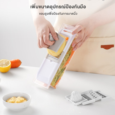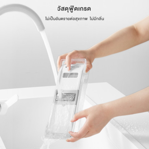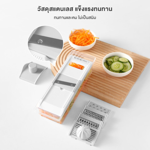 ภาชนะรองรับในตัว – มีกล่องใสสำหรับรองรับผักและผลไม้ที่หั่นเสร็จแล้ว ทำให้พื้นที่เตรียมอาหารเป็นระเบียบ และสามารถยกไปใช้ต่อหรือแช่เย็นได้ทันที