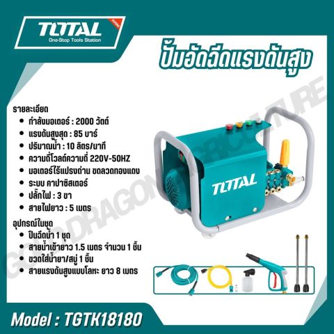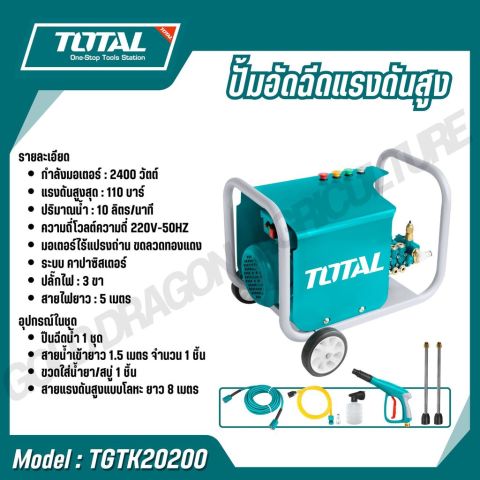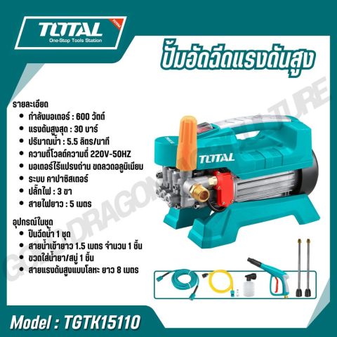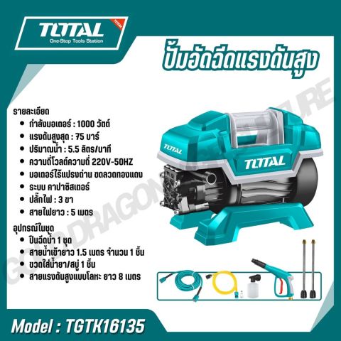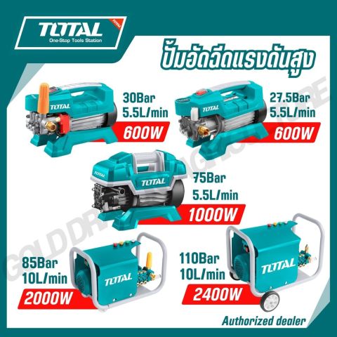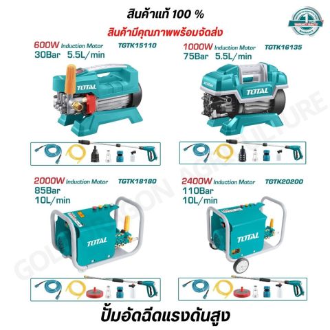 TOTAL ปั้มอัดฉีดแรงดันสูง รุ่น TGTK15110 / TGTK16135 / TGTK18180 / TGTK20200 / TGTK14105 ตัวช่วยทำความสะอาดที่ให้แรงดันน้ำคม แรงสม่ำเสมอ เหมาะสำหรับล้างรถ ล้างพื้น คราบตะไคร่ คราบฝุ่นแน่นตามรั้ว/ผนัง และงานทำความสะอาดรอบบ้าน ใช้งานได้กับไฟบ้าน พร้อมอุปกรณ์ครบสำหรับตลาดประเทศไทย (ปลั๊กไทยแลนด์)