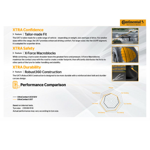 ยาง Continental UltraContact UX7 ปี 2025 รุ่นท็อปสำหรับรถ SUV / Crossover / MPV ที่ต้องการทั้งความปลอดภัยสูงสุด การยึดเกาะถนนยอดเยี่ยม ความนุ่มเงียบ และความทนทานในเส้นเดียว เหมาะทั้งการขับขี่ในเมืองที่ต้องเจอรถติดและเบรกบ่อย ไปจนถึงการเดินทางไกลที่ใช้ความเร็วต่อเนื่อง ให้คุณมั่นใจทุกสภาพถนนและทุกสภาพอากาศ